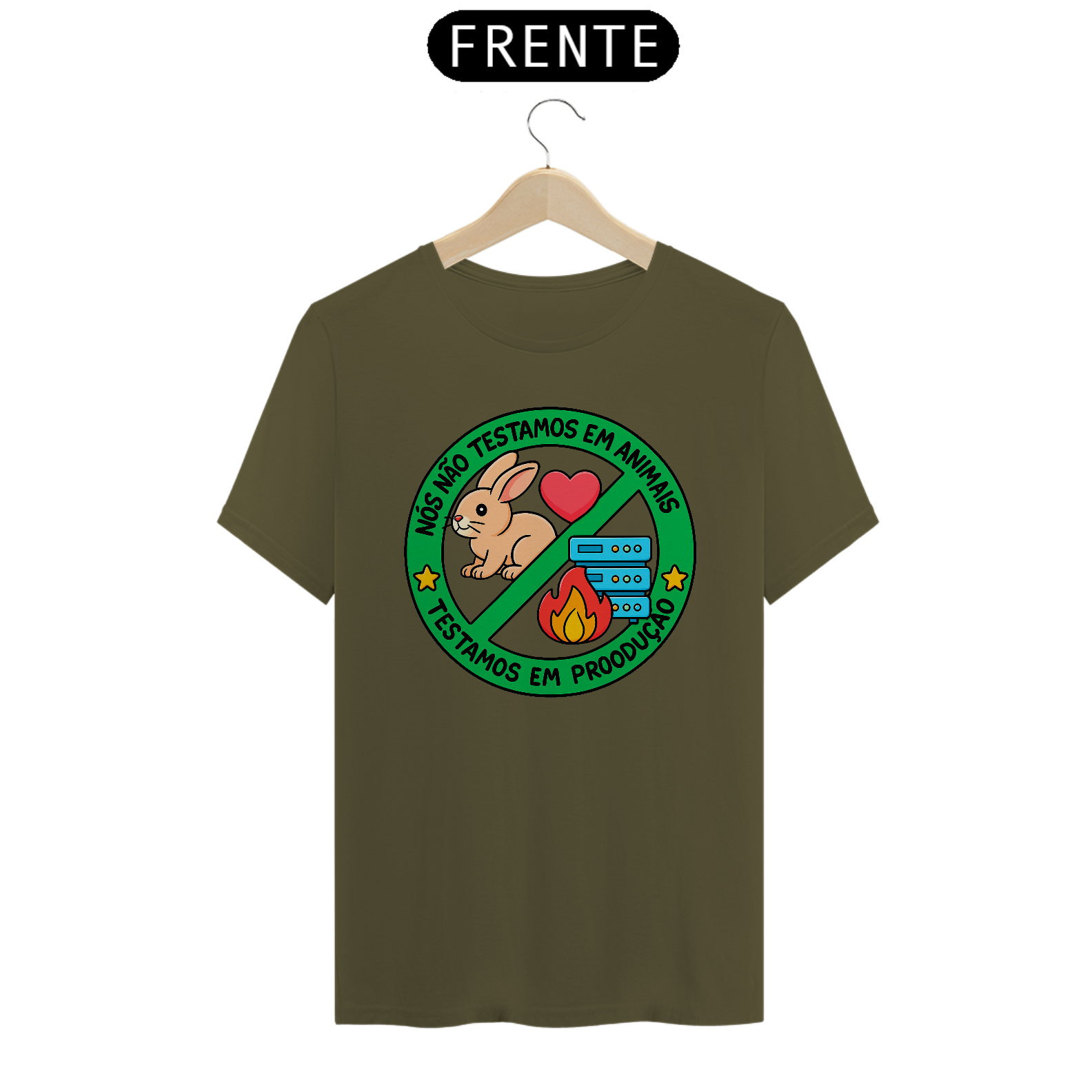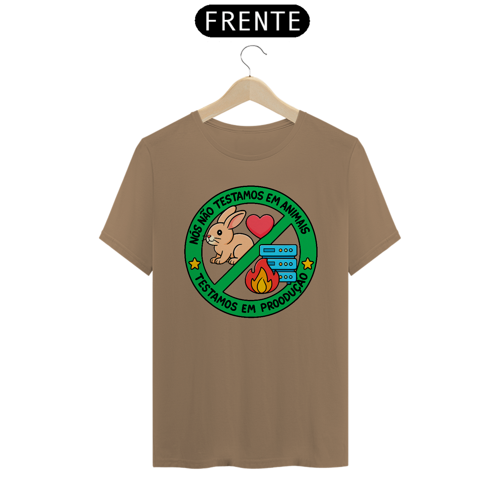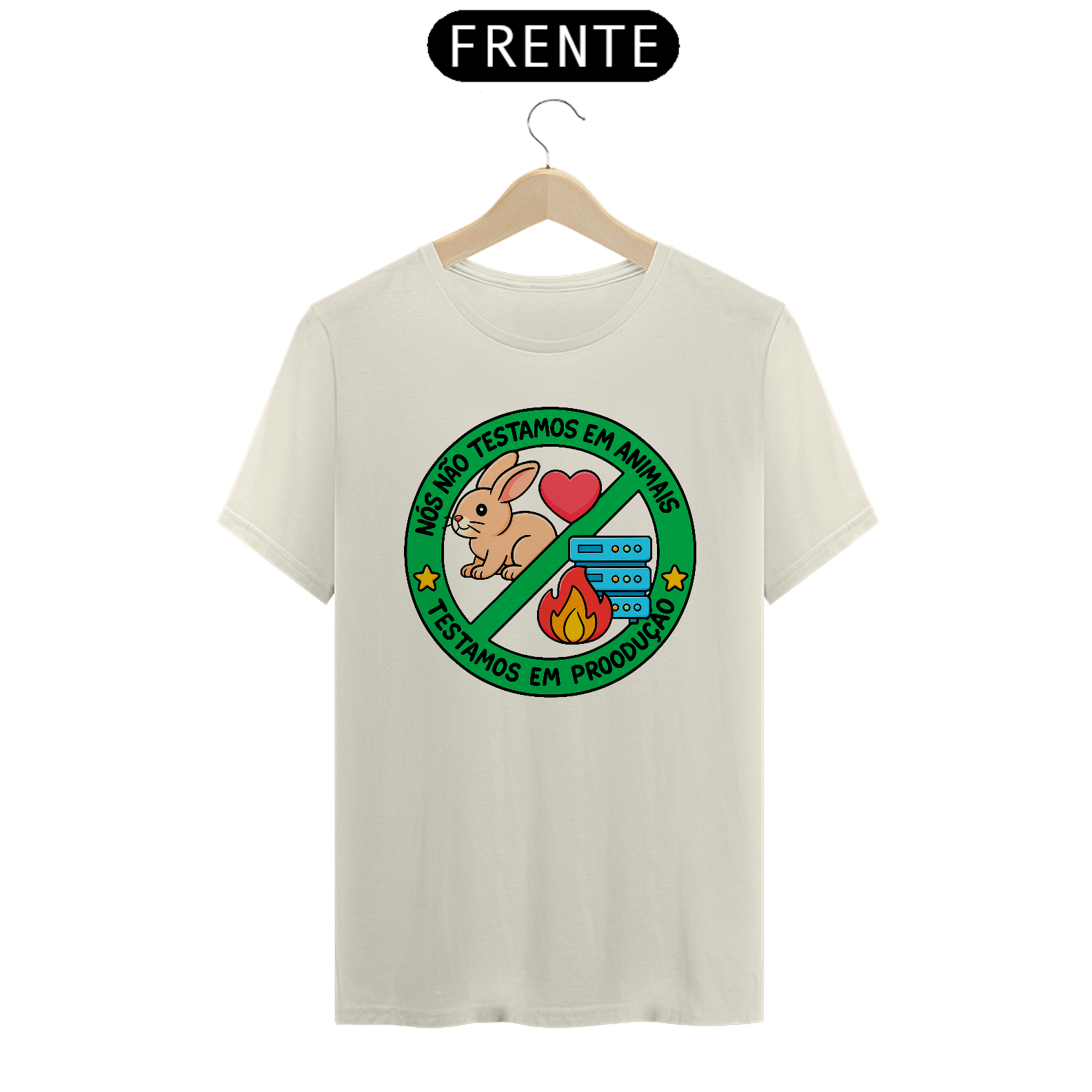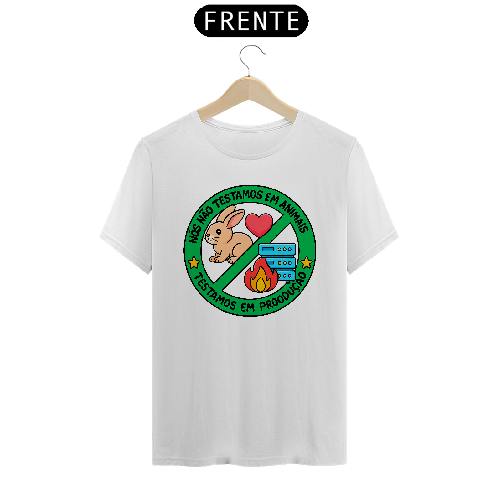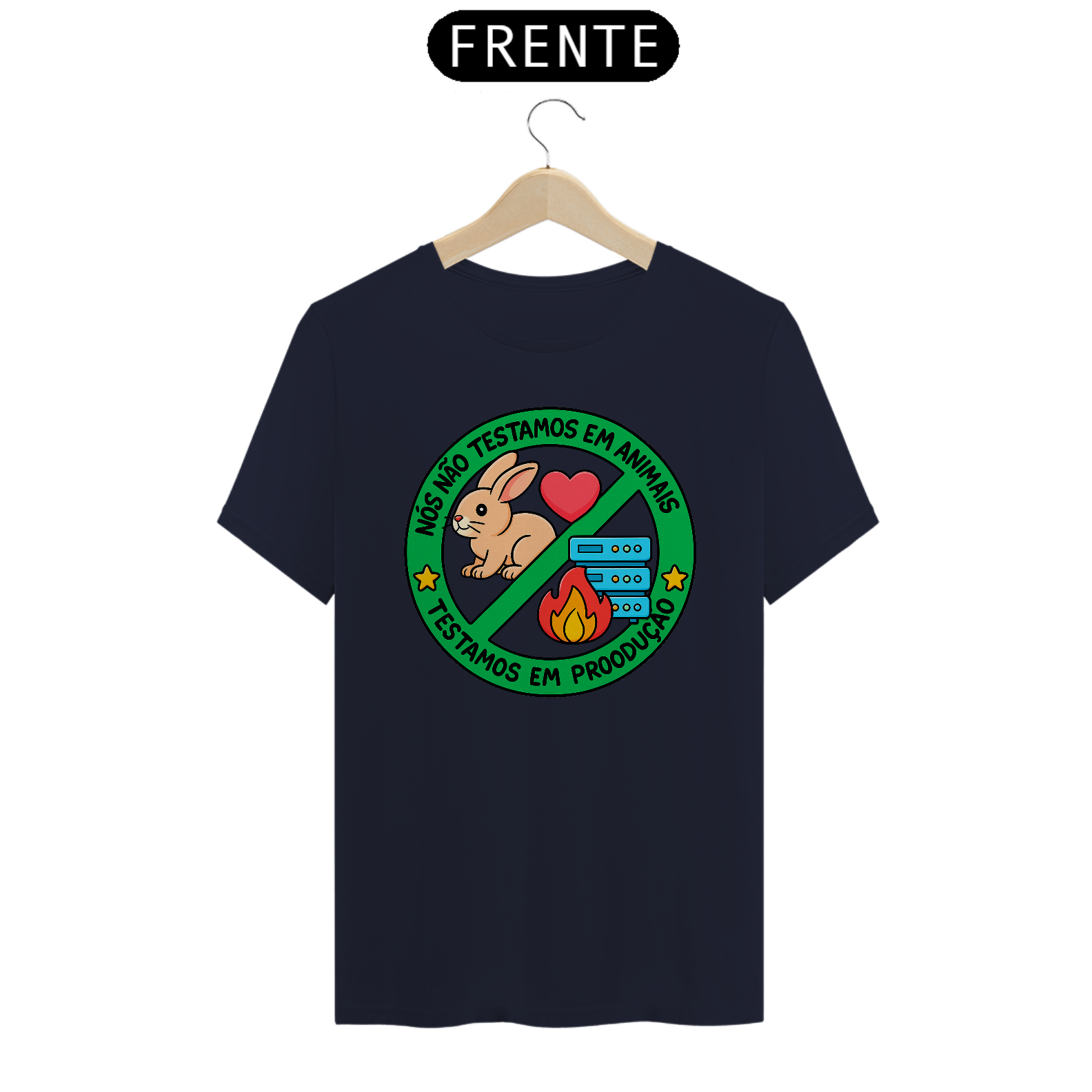 Se você é programador, sabe que a vida real nem sempre permite um ambiente de testes... e é aí que a mágica (ou o caos) acontece! Esta camiseta une humor e verdade com a icônica frase: "Nós não testamos em animais. Testamos em produção."